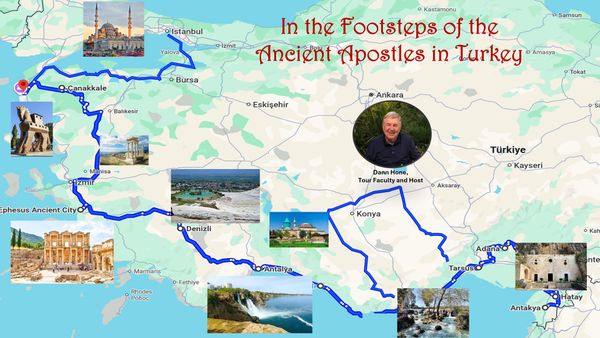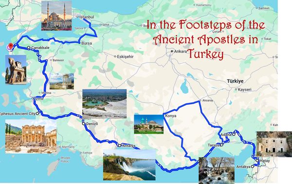 Antakya (Antioch), Hatay, Adana, Tarsus, Konya, Sille Village, Antioch in Pisidia (Yalvaç), Antalya, Perge, Demre, St. Nicholas Church, Myra, Denizli, Colossae, Honaz, Laodicea, Pamukkale, Hierapolis, Philadelphia, Sardis, Smyrna, Izmir, Agora, Şirince Village, Kusadasi, Ephesus (ancient city, the House of Virgin Mary, St. John Church, etc.), Thyatira, Pergamon, Ayvalık, Assos, Alexandria Troas, Troy, Canakkale, Bandirma, Bursa, Iznik (Nicaea), Istanbul (Bosphorus Cruise, Chora Church, Ecumenical Patriarchate, Saint Sophia, Topkapi Palace, Blue Mosque, Grand Bazaar, etc.)•